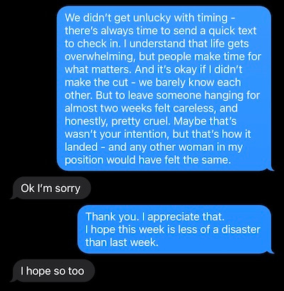 But then: we have mutual friends. We will absolutely see each other again. I can’t just leave it like this.