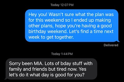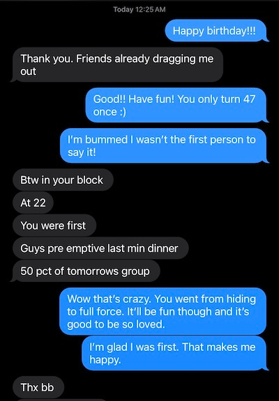 On Tuesday, I sent him a happy birthday text at midnight.