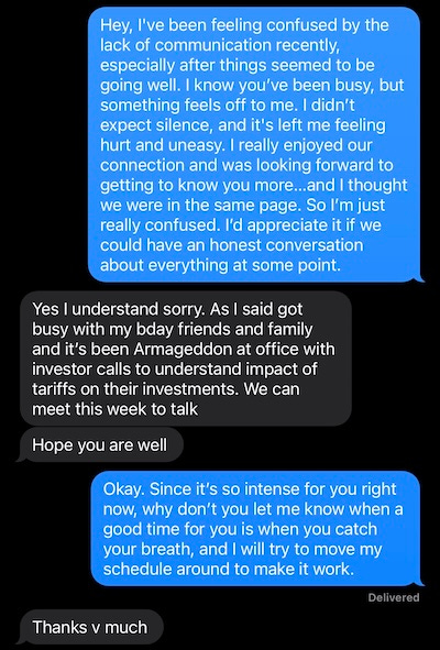 He texted me from work and called me the next day. The flag turned yellow.